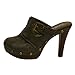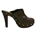 These adorable shoes feature a chunky wooden tone heel and a front platform. They have a clog style front and an open back. Large antique gold tone studs nicely decorate the base of the platform as well as the top of the shoe. Super comfortable to walk in